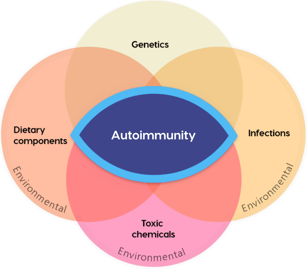 It is now known that genetics play a relatively small part in the development of autoimmune disorders, and that environmental factors have a greater role.